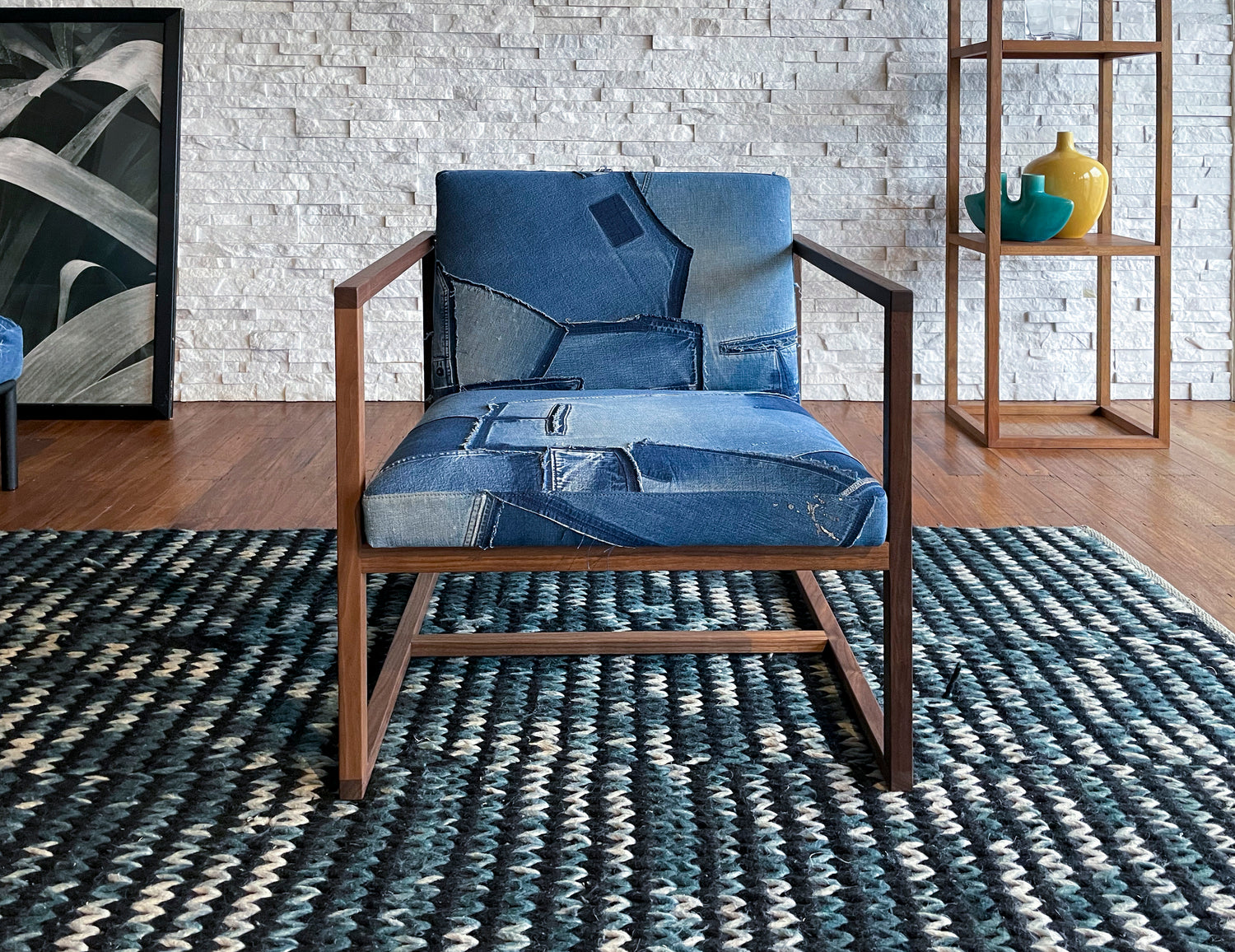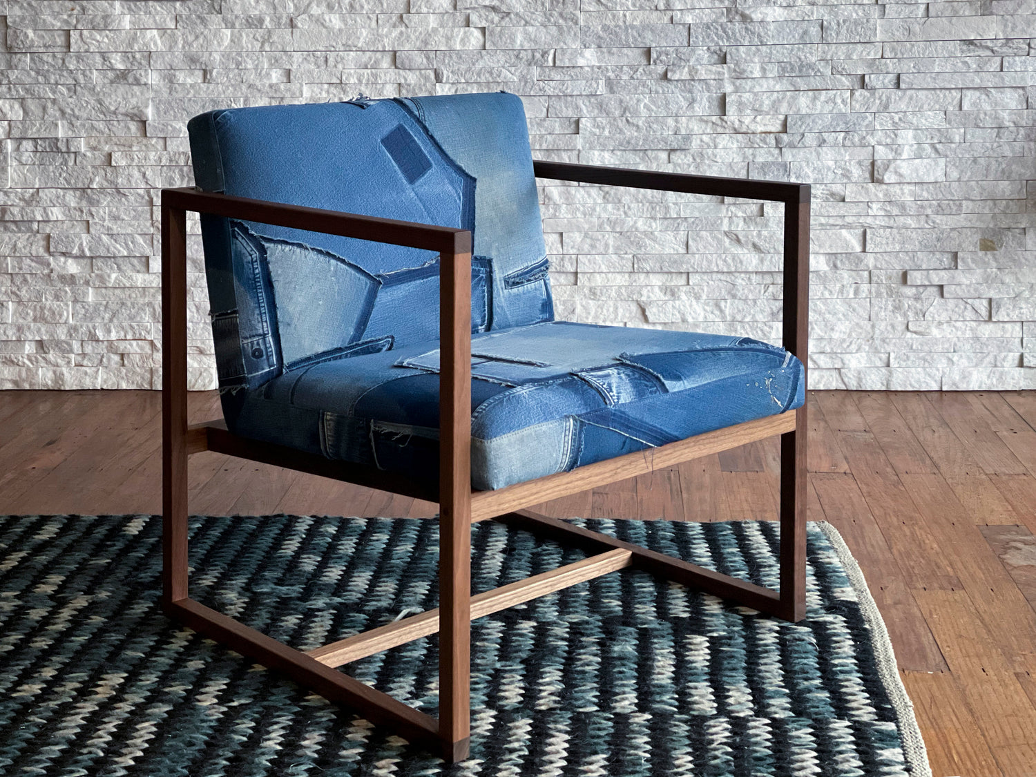 限られたリビングのスペースに置けるコンパクトサイズのアームチェアです。誰でも片手で動かせるように、軽く作られていますが、座り心地はソファのようにクッション性があります。25mm角の細いフレームは軽やかで、シャープさが上品さを際立てます。KOKOROISHI KOUGEIのLIGHT LOUNGEモデルをベースに、REKROWの生地を全面にまとい、存在感のある「RW_ LIGHT LOUNGE」は誕生しました。