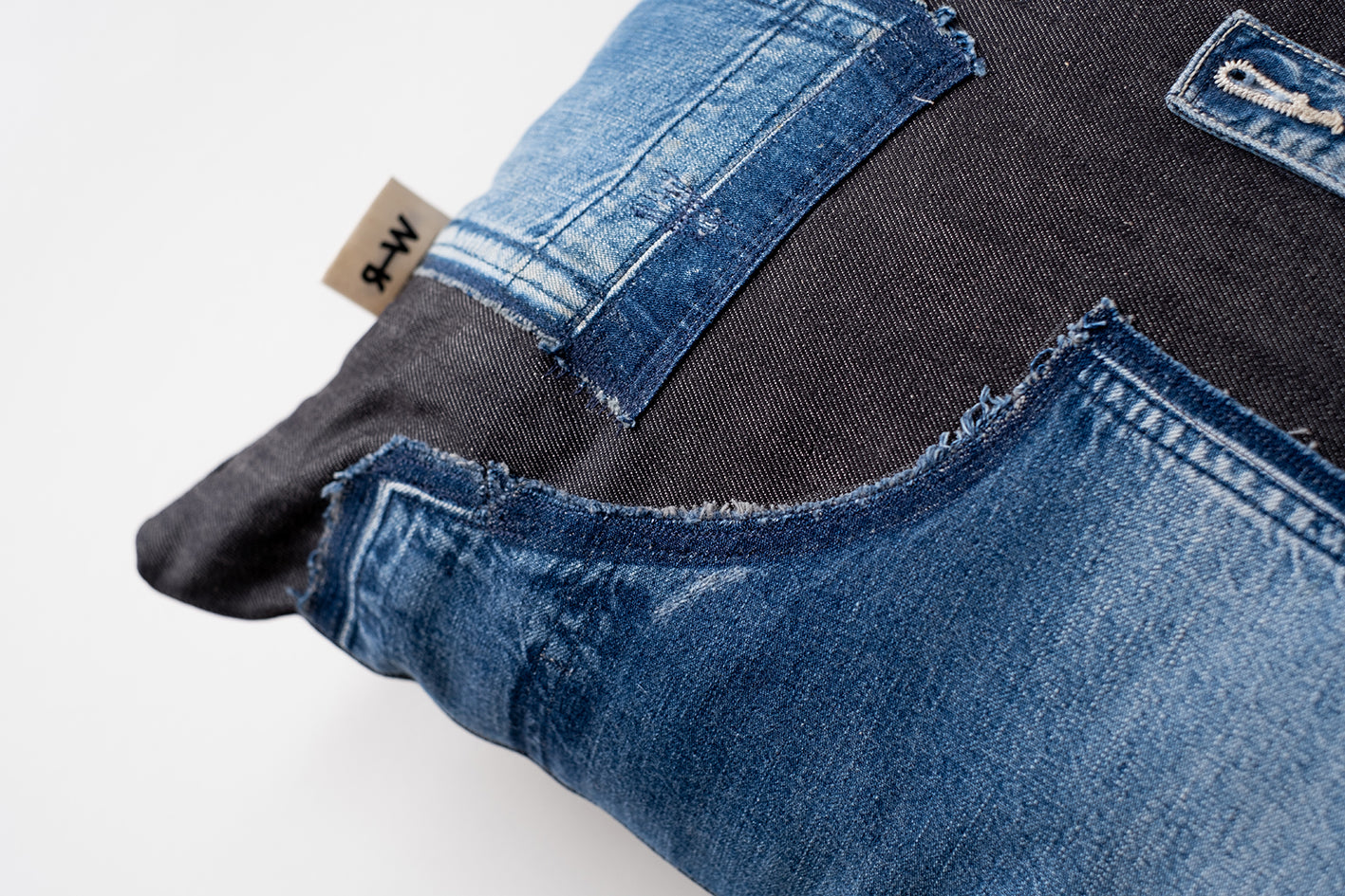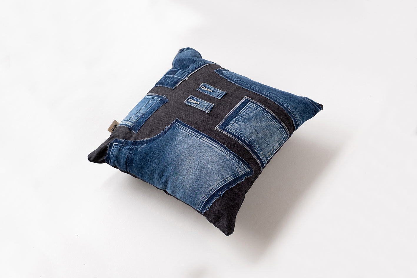 クッションカバーの生地は篠原テキスタイルのネイビーカラーのデニムを使用し、前面には、REKROWのUSED DENIMをほどき、ワークウェアのパーツをパネル状にデザイン。 手仕事で配した1点1点異なるデザインの、Made in BINGOのREKROWオリジナルクッションです。