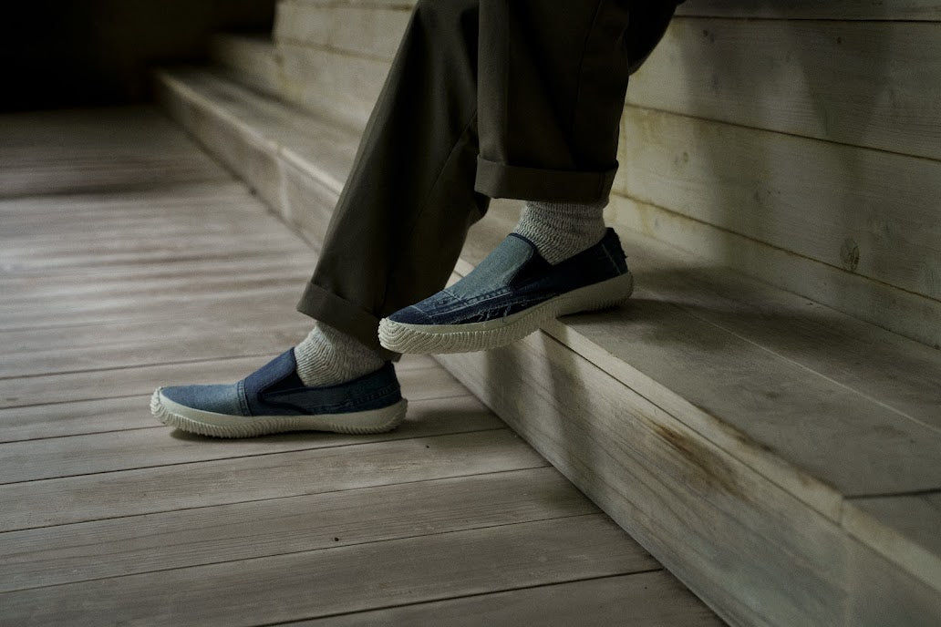 SPINGLE MOVE SPM-295のデザインをベースに、アッパー素材をREKROWのUSED INDIGO DENIM PATCHWORK 100%で仕上げたスリッポンタイプのスニーカー。