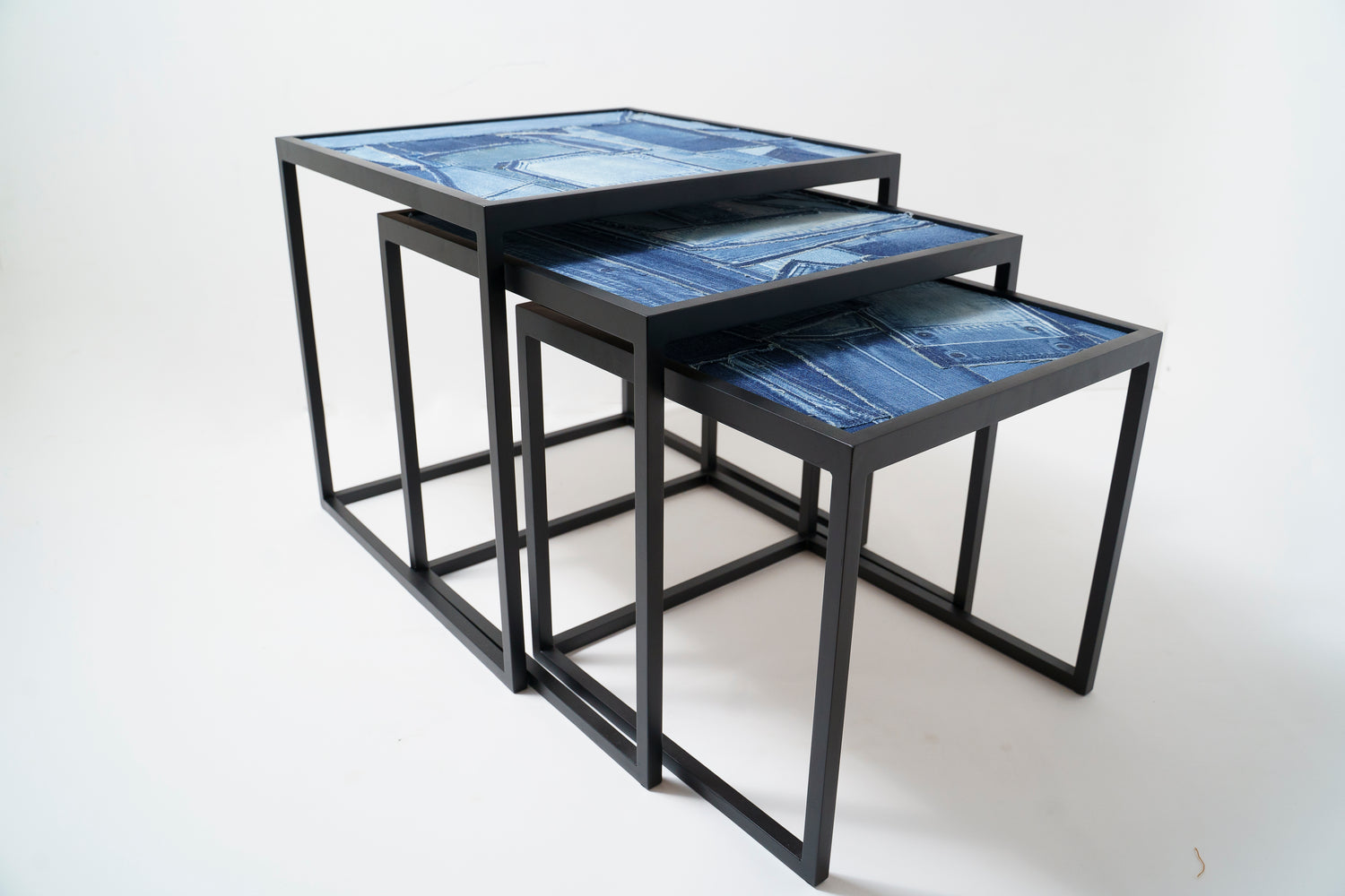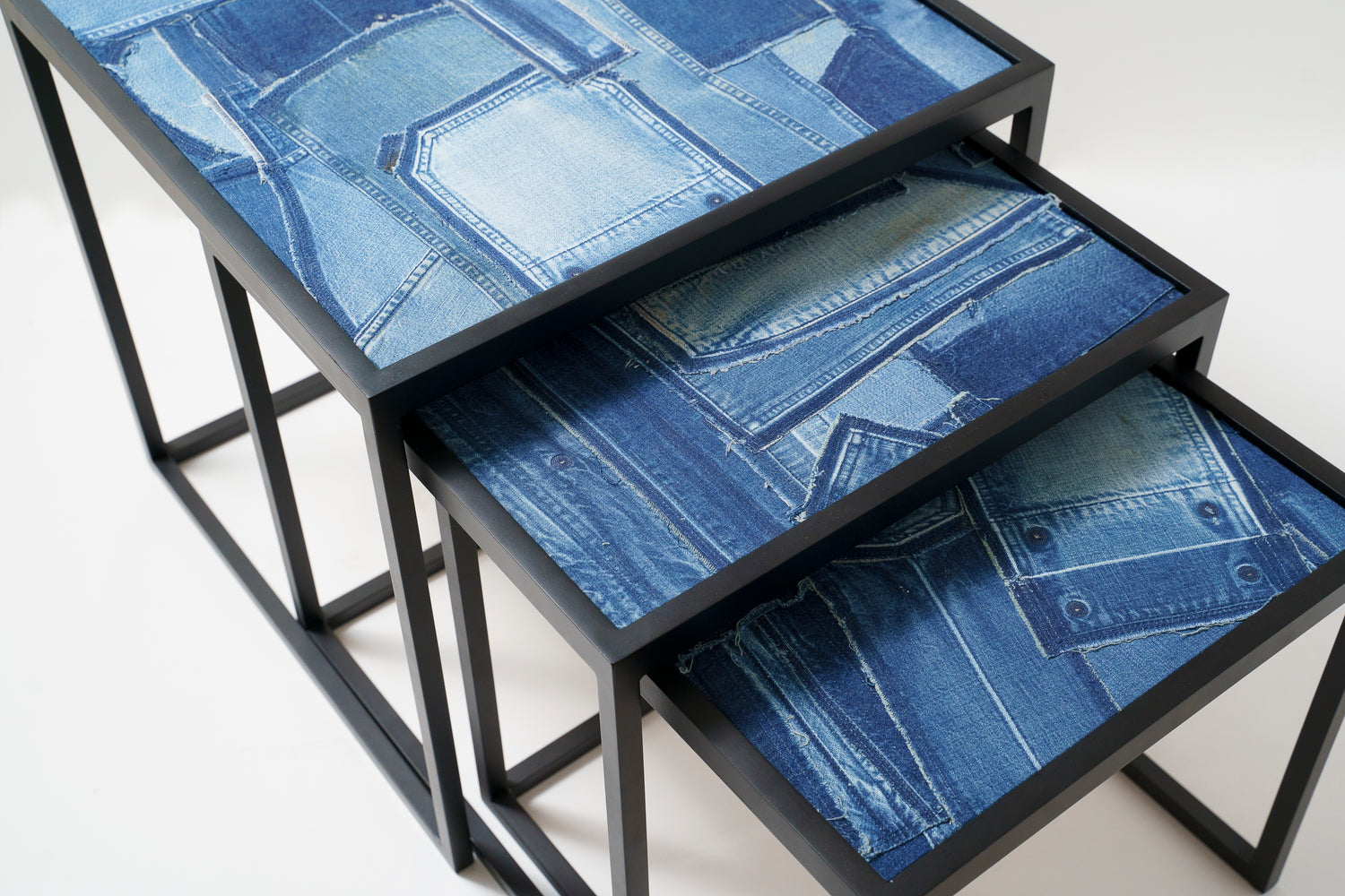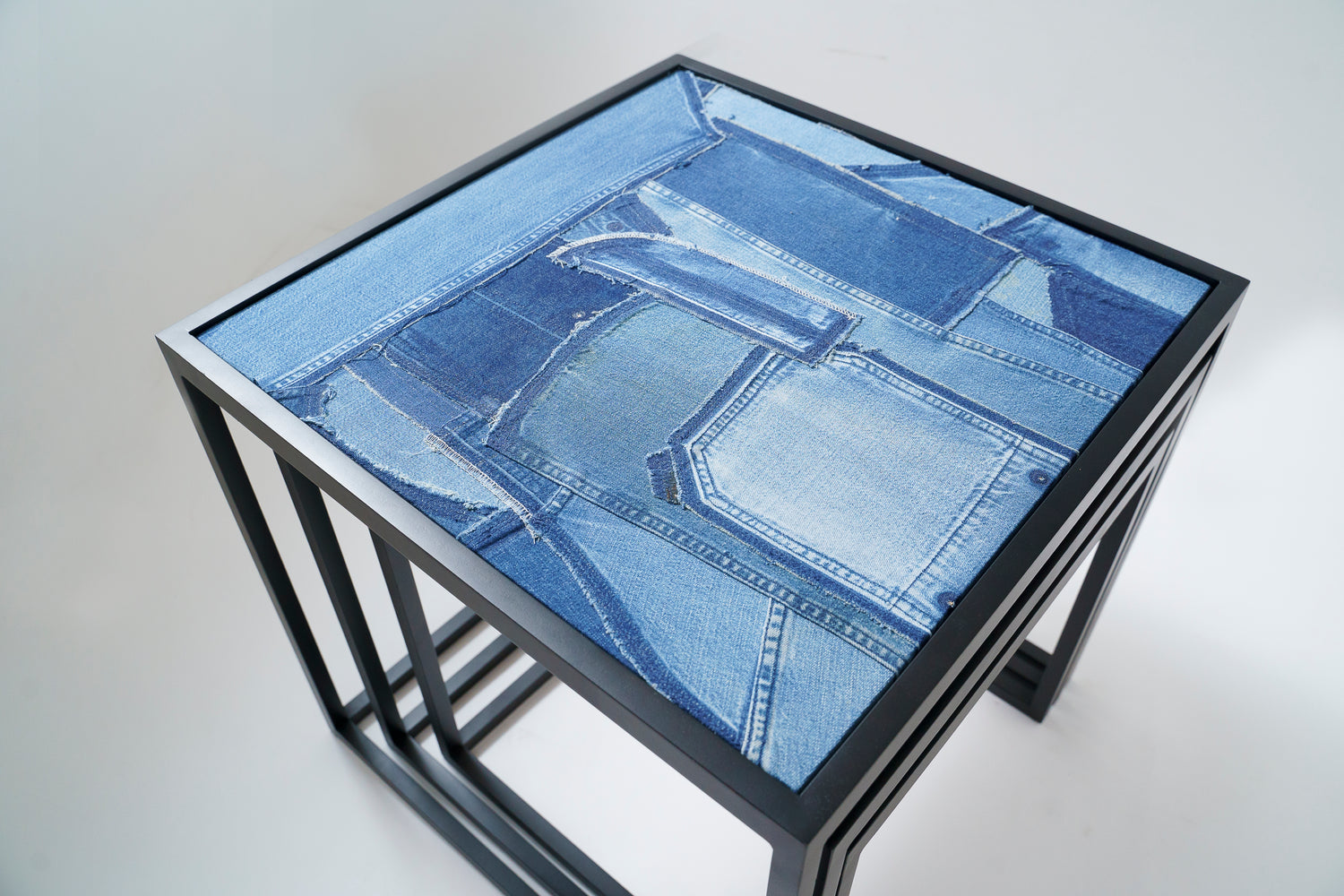 造船のまち、せとうちは古くから鉄の町としても産業が栄えてきました。ネストテーブルは、錨の技術で家具を作るTAonTAにフレームを製作いただき、天板にRWのデニムと木目素材を表裏で張り合わせ、表情を変えて使える、入れ子式のテーブルセットです。