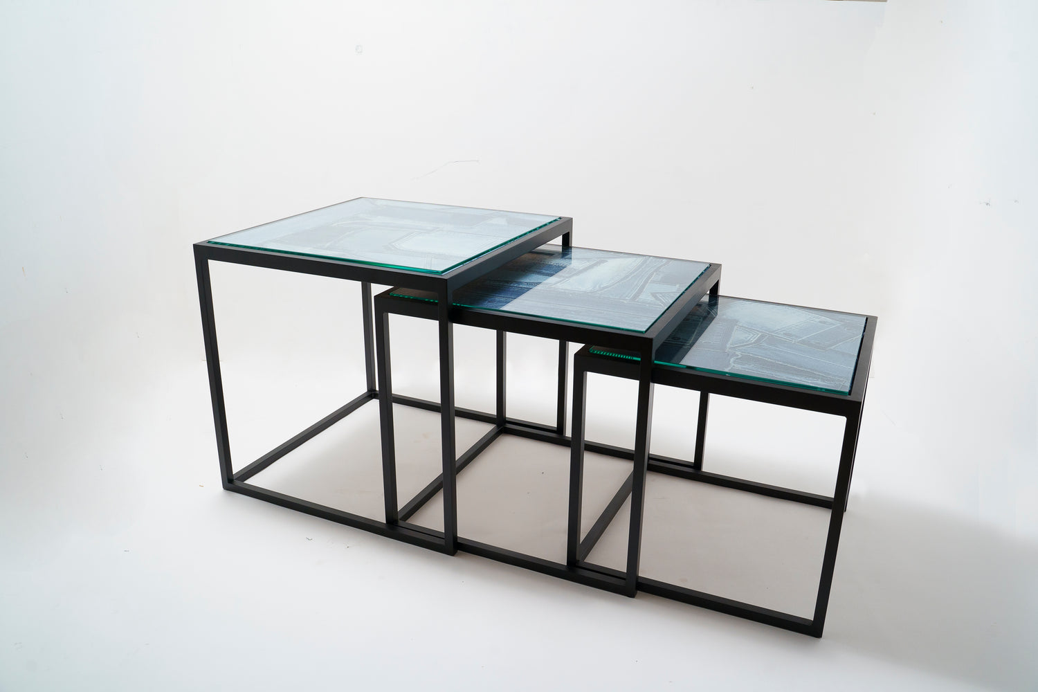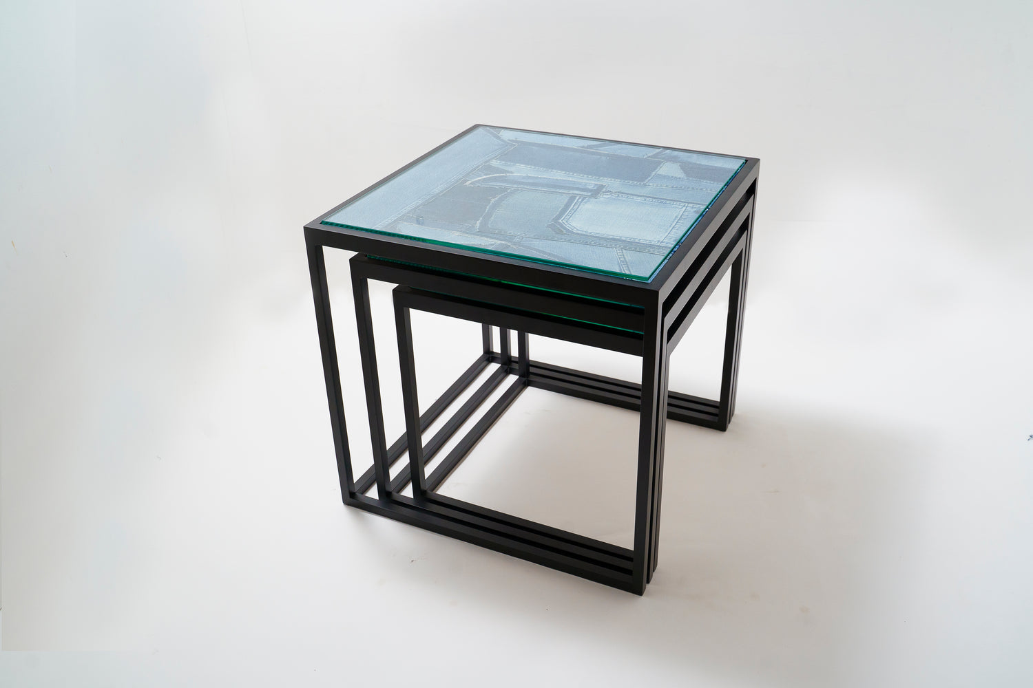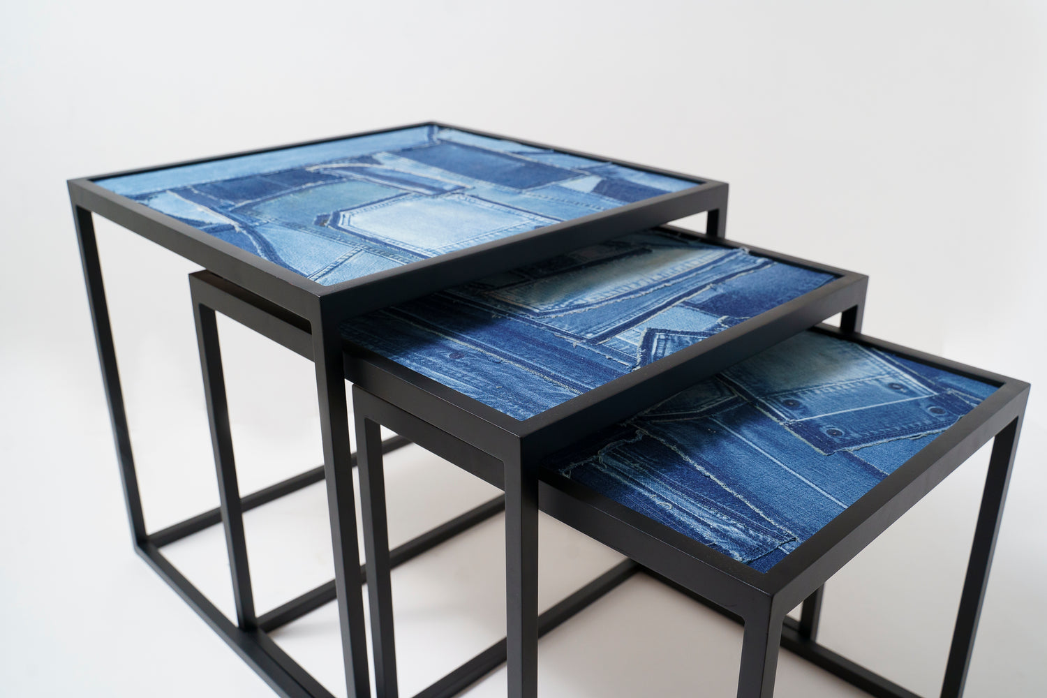 造船のまち、せとうちは古くから鉄の町としても産業が栄えてきました。ネストテーブルは、錨の技術で家具を作るTAonTAにフレームを製作いただき、天板にRWのデニムと木目素材を表裏で張り合わせ、表情を変えて使える、入れ子式のテーブルセットです。