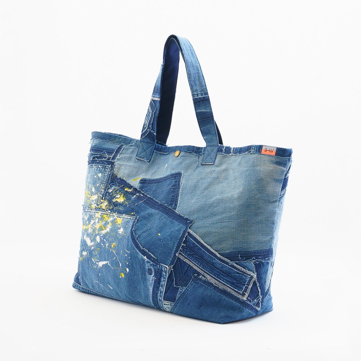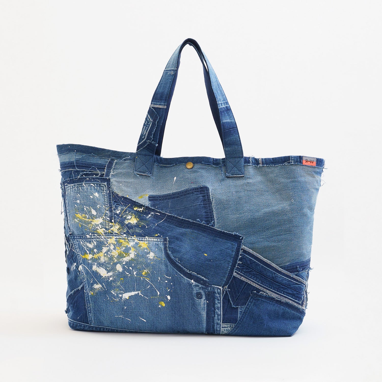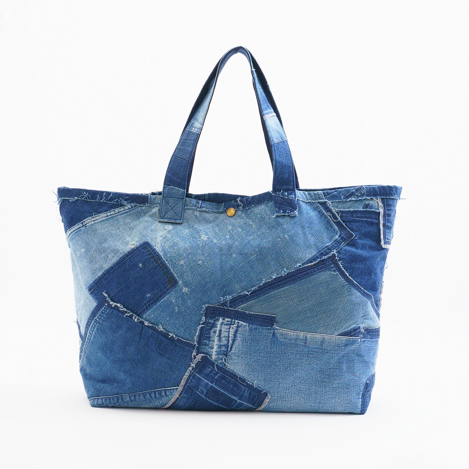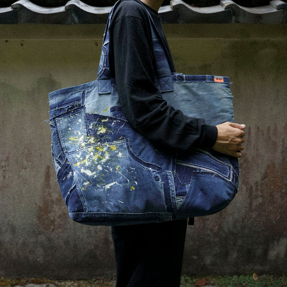 ワークウエアをほどき、パッチワークにし、縫製と加工を施しバッグを作り上げていく。この商品はすべての行程を福山の繊維産地で生産しています。ものづくりの町で生まれたワークウエアがものづくりの方々に着用され、またこの町に戻ってくる。このプロダクトを通してREKROWの目指す循環が産地より生まれ、そして産地から波紋が生まれていくことを目指しています。