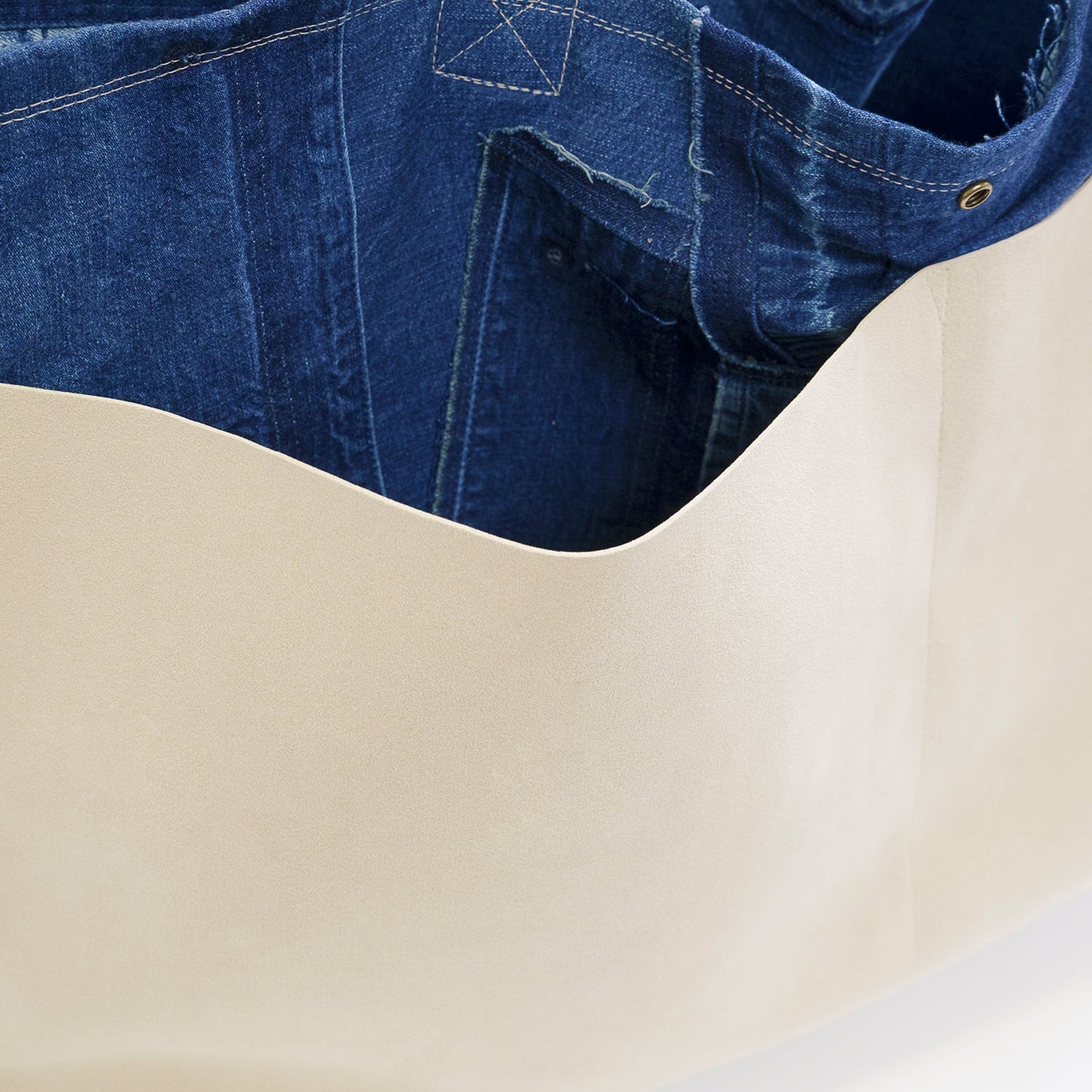 No.1のマテリアルは、瀬戸内の造船所で約1年間着用されたデニム地のワークウエアで、デニム生地は世界に誇るジャパンクオリティ「カイハラデニム」で開発されたオリジナルです。溶接、塗装など、造船所で働く方の仕事が写しとられた生地は、一つとして同じものはありません。それを丁寧にほどいて新たな商品として作製しています。唯一無二の味わい深い素材です。退色や変色、シミ汚れ、糸切れや穴空きは働きながら自然に生みだされたものです。それらの魅力を伝えるためあえてその痕跡を残し使用しています。