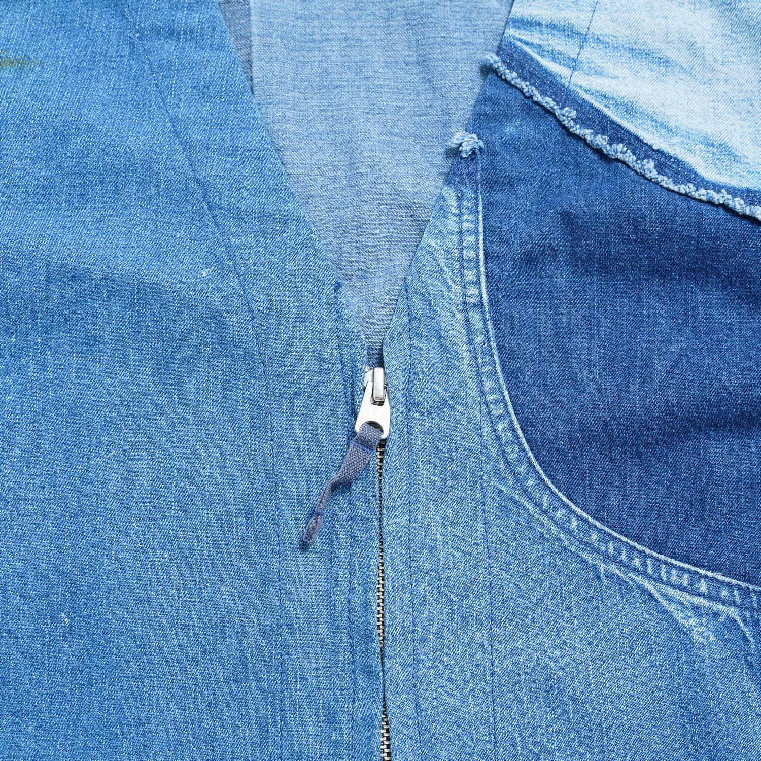 No.1のマテリアルは、瀬戸内の造船所で約1年間着用されたデニム地のワークウエアで、デニム生地は世界に誇るジャパンクオリティ「カイハラデニム」で開発されたオリジナルです。溶接、塗装など、造船所で働く方の仕事が写しとられた生地は、一つとして同じものはありません。それを丁寧にほどいて新たな商品として作製しています。唯一無二の味わい深い素材です。退色や変色、シミ汚れ、糸切れや穴空きは働きながら自然に生みだされたものです。それらの魅力を伝えるためあえてその痕跡を残し使用しています。