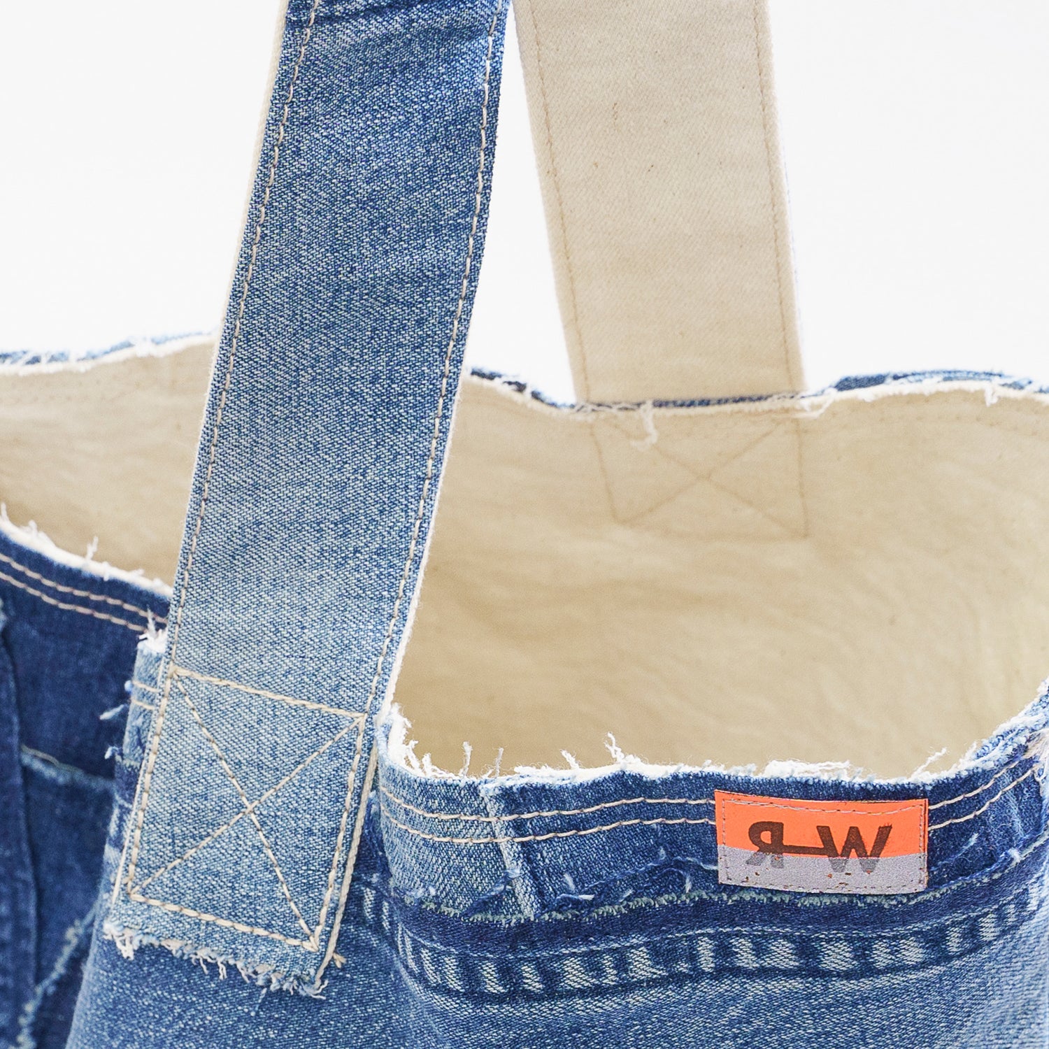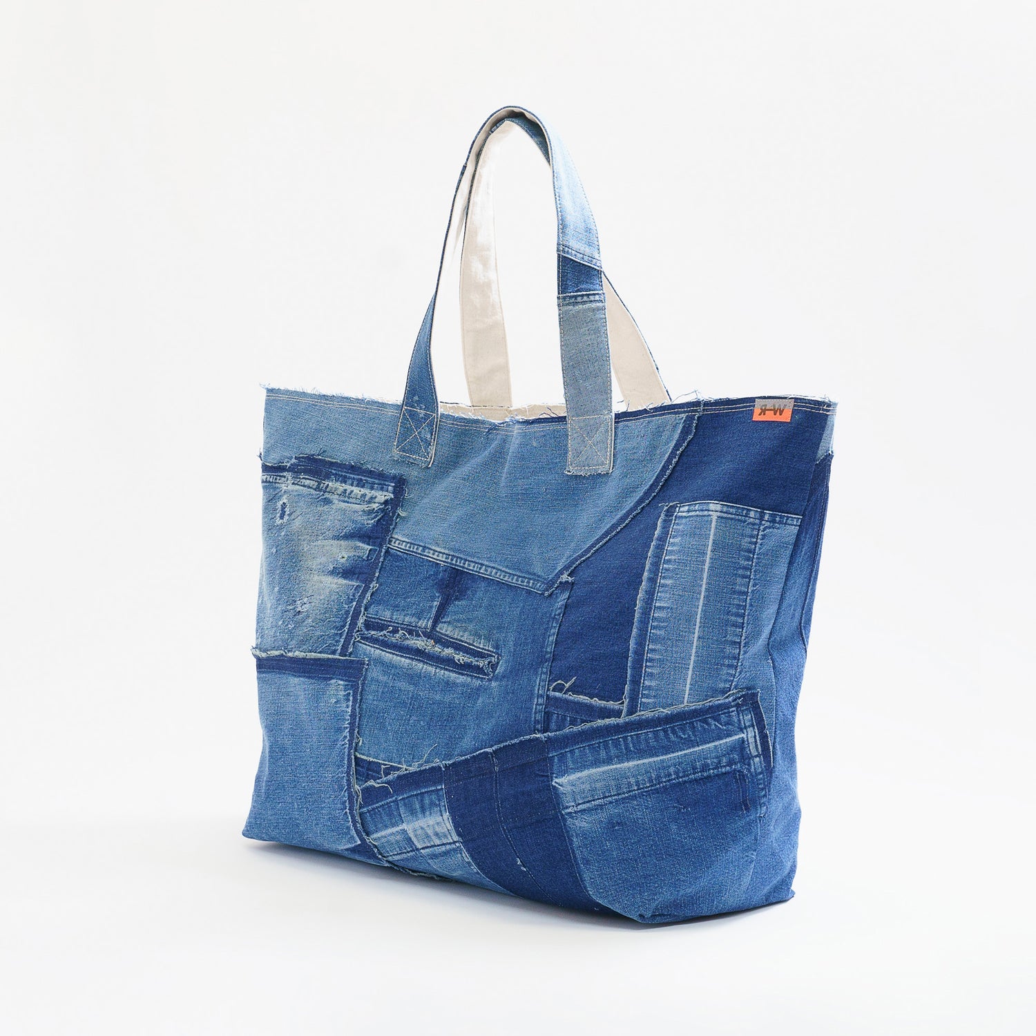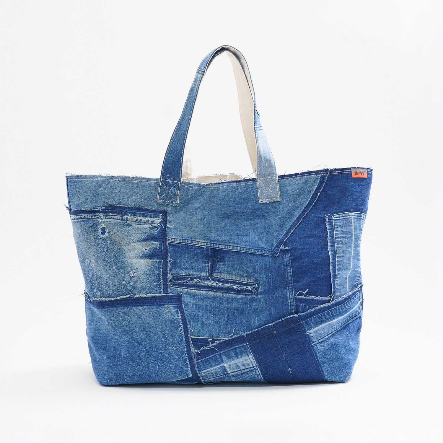 ワークウエアをほどき、パッチワークにし、縫製と加工を施しバッグを作り上げていく。この商品はすべての行程を福山の繊維産地で生産しています。ものづくりの町で生まれたワークウエアがものづくりの方々に着用され、またこの町に戻ってくる。このプロダクトを通してREKROWの目指す循環が産地より生まれ、そして産地から波紋が生まれていくことを目指しています。