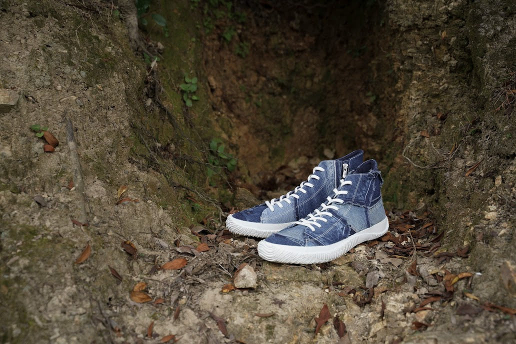 SPINGLE MOVE SPM-467のデザインをベースに、アッパー素材をREKROWのUSED INDIGO DENIM PATCHWORK 100%で仕上げたハイカットスニーカー。